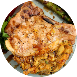 Thick sliced cured pork chops stuffed with a seasoned mixture seared to a golden-brown, and finished in the oven with your own glaze or sauce.